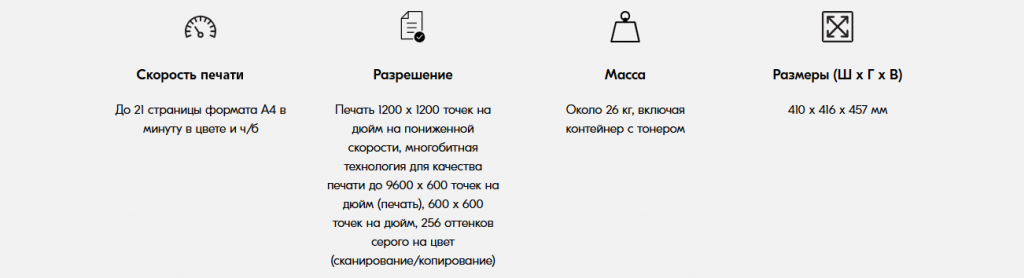 • Скорость печати до 21 страниц в минуту чёрно-белой и цветной печати формата A4