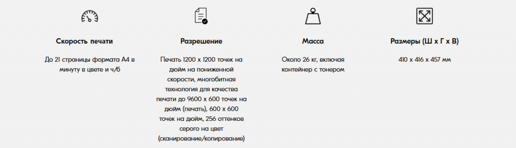 • Скорость печати до 21 страниц в минуту чёрно-белой и цветной печати формата A4
