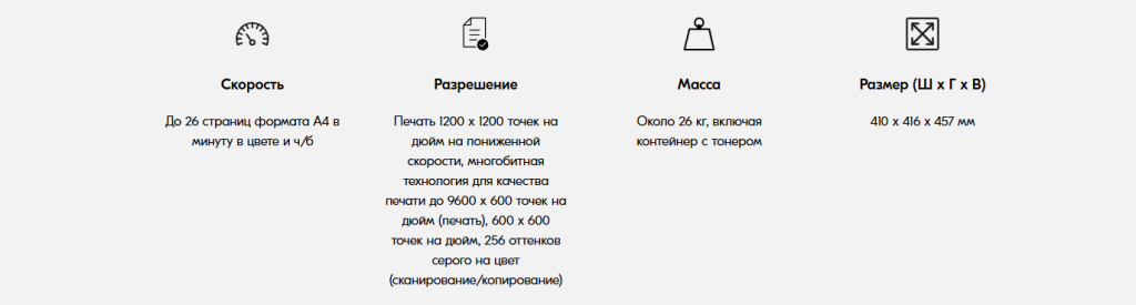 - Скорость печати до 26 стр./мин в черно-белом режиме и 26 стр./мин в цветном режиме