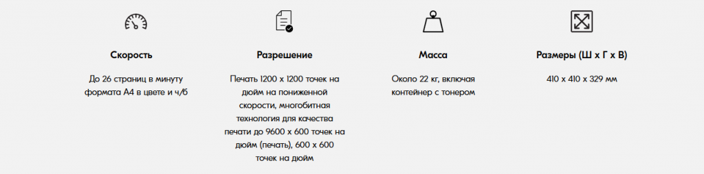 • Скорость печати до 26 страниц в минуту чёрно-белой и цветной печати формата A4