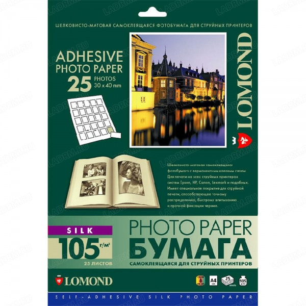 LOMOND 2312073 фотобумага самоклеющаяся шелковисто-матовая 25 частей А4 (30 x 40 мм) 105 г/м2, 25 листов