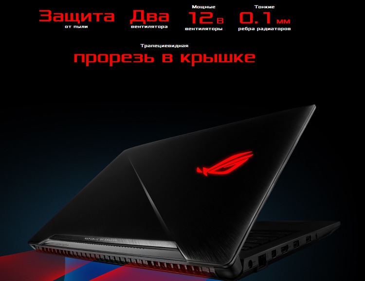 Ноутбук ROG Strix GL503 оснащается высокоэффективной системой охлаждения, гарантирующей стабильную работу устройства во время длительных игровых сессий. Она автоматически регулирует скорость вращения вентиляторов, чтобы добиться оптимального баланса между уровнем шума и температурой компонентов. Вентиляционные отверстия, расположенные над клавиатурой и в днище корпуса, обеспечивают достаточный приток холодного воздуха, а уже нагретый воздух выбрасывается наружу через заднюю панель, чему способствует оригинальная форма крышки дисплея – с трапециевидным вырезом. В системе охлаждения применяются мощные вентиляторы 12В, а также реализована защита от накопления пыли.