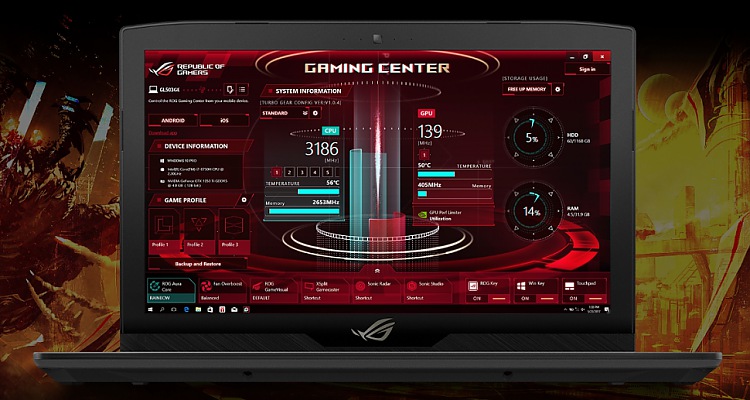 Программное обеспечение ROG Gaming Center – это комплексный центр управления ноутбуком, запускающийся одним нажатием на «горячую» клавишу. С его помощью можно, например, просмотреть данные аппаратного мониторинга, такие как частота центрального и графического процессора, напряжение питания и температура компонентов, а затем внести необходимые изменения в настройки системы. Отсюда же запускаются различные дополнительные утилиты: для управления сетевым трафиком (GameFirst V), настройки звуковой подсистемы (Sonic Studio III), оптимизации изображения (GameVisual), регулировки подсветки (Aura Core) и организации онлайн-трансляции игрового процесса (XSplit Gamecaster). Программное обеспечение ROG Gaming Center предлагается не только для операционной системы Windows, но и в виде мобильного приложения для Android и iOS. Это значит, что вы сможете изменять настройки ноутбука прямо со всего мобильного гаджета!